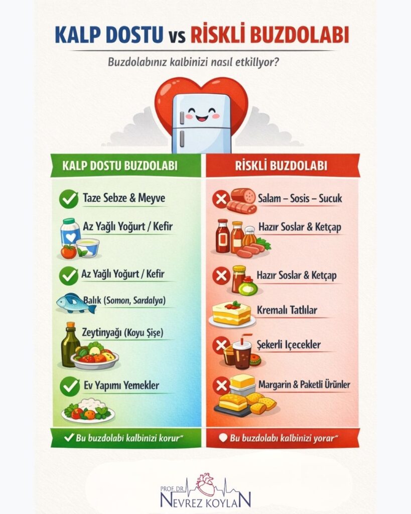 Buzdolabı, sağlıklı yaşamın kalesi gibi görünür. Ancak çoğu evde buzdolabı; yüksek tuz, doymuş yağ, trans yağ ve ilave şeker içeren ürünlerle doludur. Bu içerikler zamanla hipertansiyon, dislipidemi, damar sertliği ve koroner kalp hastalığı riskini artırır. Bu yazıda, kalbiniz için buzdolabındaki tehlikeler nelerdir; hangi gıdalar risklidir ve kalp dostu bir buzdolabı nasıl oluşturulur, güncel bilimsel veriler ışığında ele alıyoruz.
