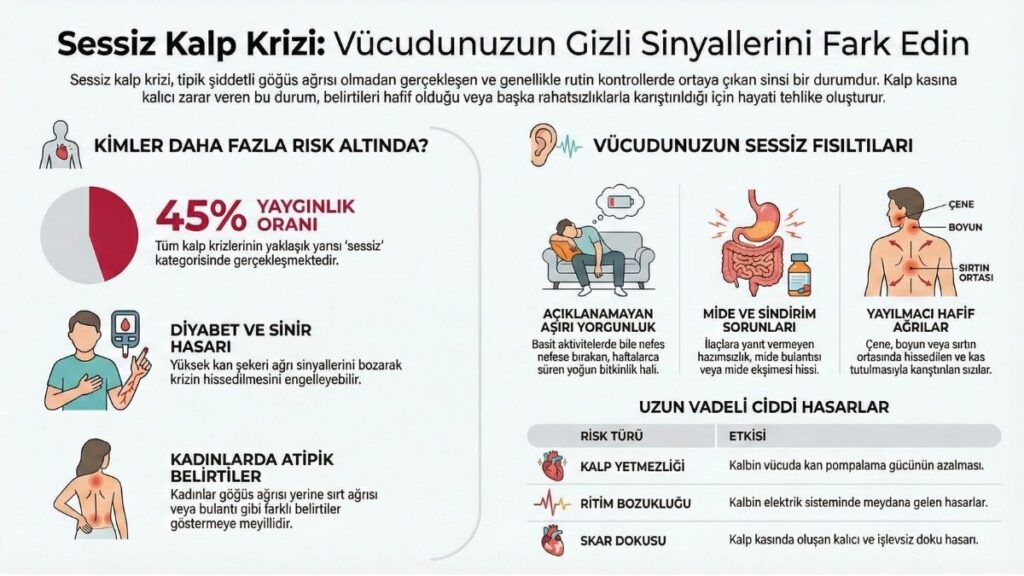 Bu durum, kalbin zarar görmediği anlamına gelmez. Aksine, fark edilmediği için tedavi gecikir ve ilerleyen dönemde kalp yetersizliği, ritim bozuklukları veya ikinci bir kalp krizi riski artar.
