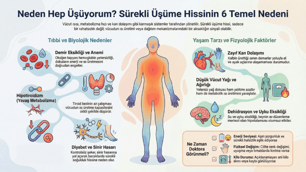 Sürekli üşümek, genellikle vücudun ısı üretimi veya dağıtım mekanizmalarındaki bir aksaklıktan kaynaklanır. Vücut ısımız, metabolizma hızımızdan kan dolaşımımıza kadar birçok karmaşık sistem tarafından yönetilir. Şimdi, bu sistemleri etkileyebilecek ve sizi sürekli bir “üşüme” modunda bırakabilecek yaygın faktörlere göz atalım.